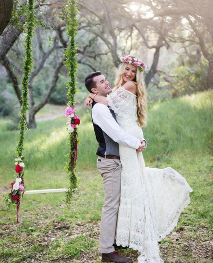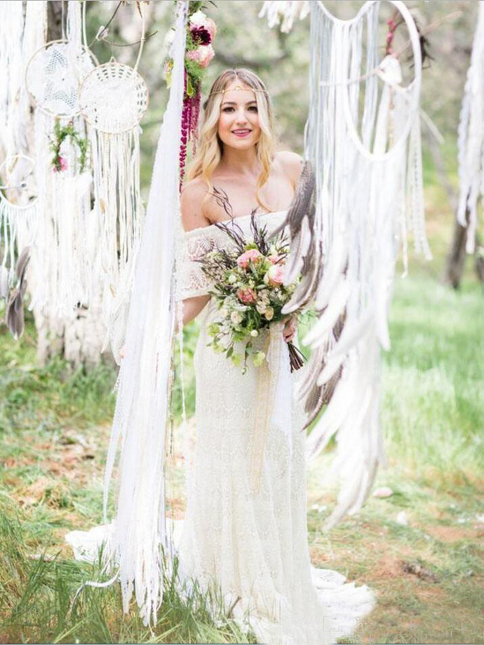 2021 Romantic Off the Shoulder Bohemian Wedding Dresses Sweep Train Lace Garden Beach Bridal Gowns Custom Made Plus Size Boho Wedding Gowns,995