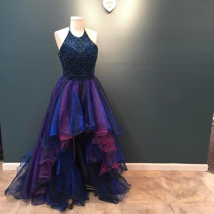 Sleeveless Halter Neck Royal Blue Crystal Organza Prom Dresses,Tulle Evening Dress,Beaded High Low Prom Gowns,Long Party Gown,1032
