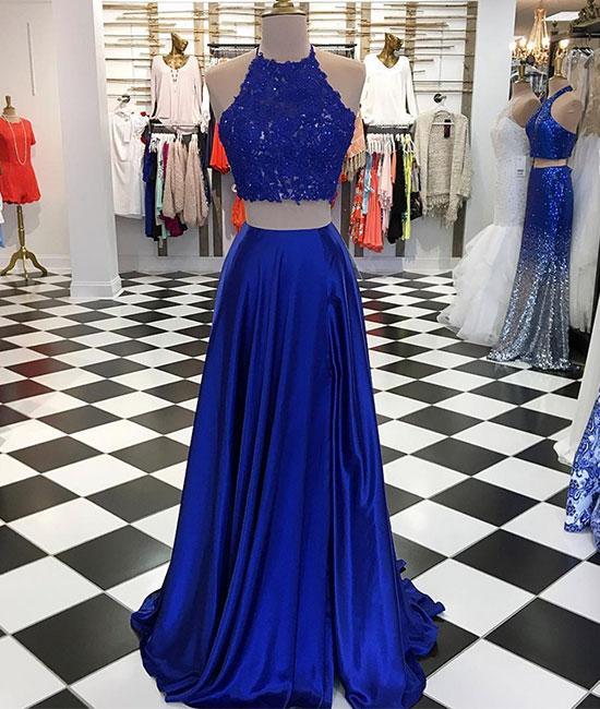 Royal Blue Two-Piece Long Prom Dress with Lace Top,Blue Evening Dress with Split,1164