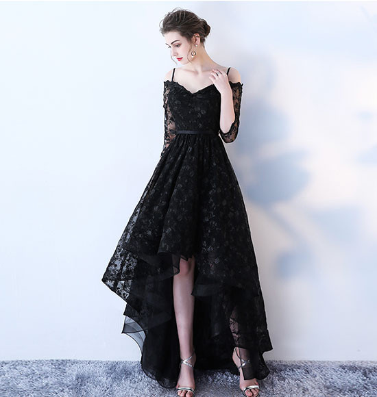 Black lace high low prom dress, long sleeve evening dress,1195
