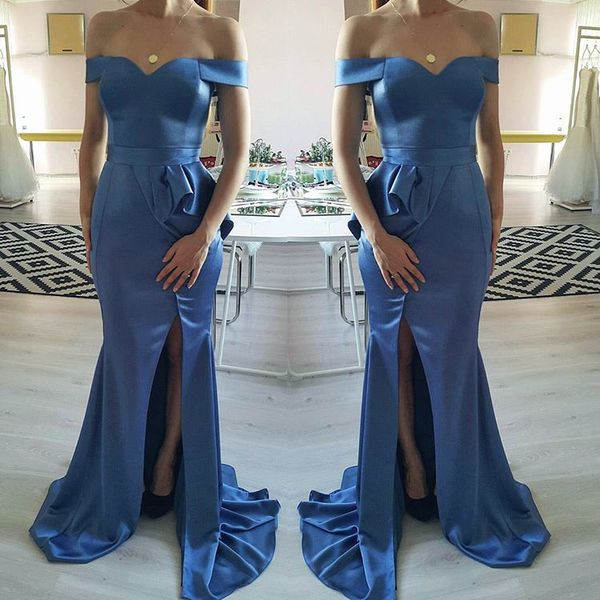 Blue Off The Shoulder Pageant Gown,Prom Dress With Slit And Ruffles,1208