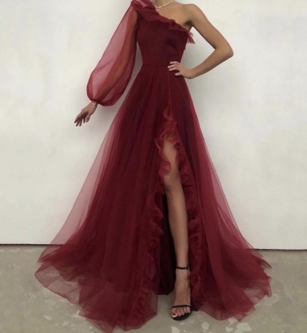 Simple One shoulder prom dress Burgundy evening dress,1222