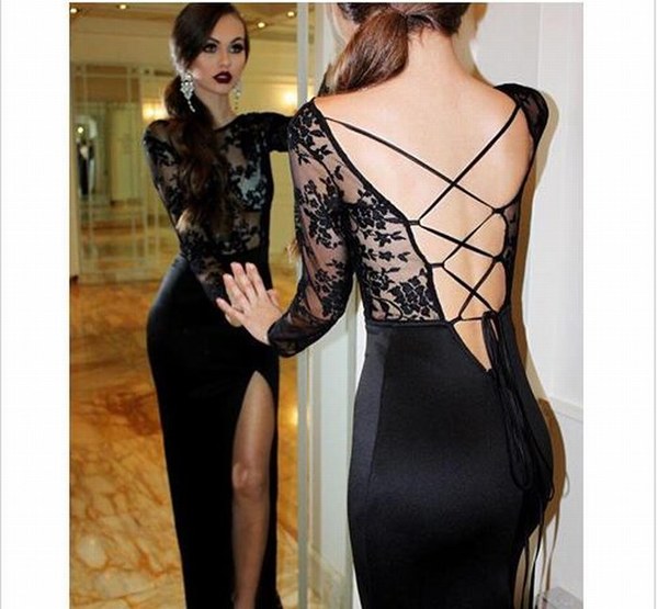 Sexy Black Lace Split Prom Dress,Long Sleeves slim Party dress,charming Floor Length Evening Wear For Women,Formal occasion evening dresses,1250