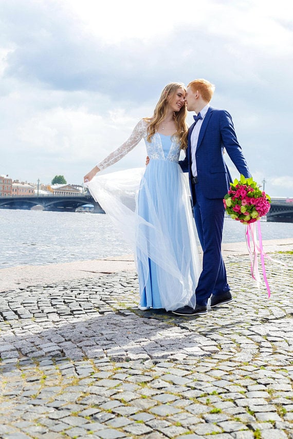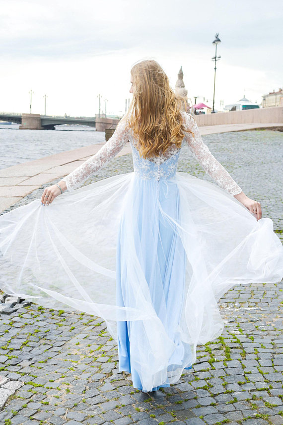 Sky Blue ALine Wedding Dresses Lace Sheer Long Sleeve Bridal Gowns,1283