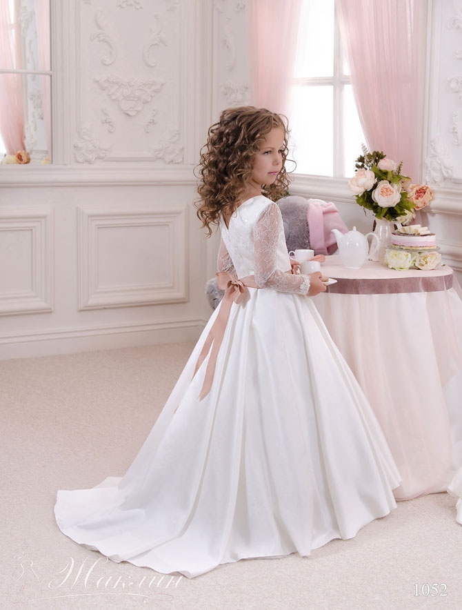 White Long Sleeve Lace V neckline Holy First Communion Dresses for Girls with Sashes Train Flower Girl Dresses for Weddings,1296