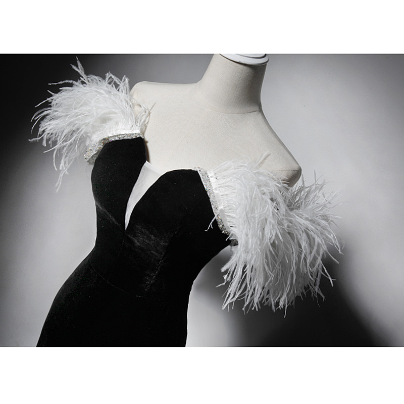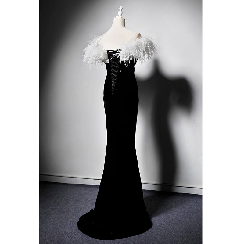 Feather Decoration Formal Black Prom Dresses Spring Long Strapless Velvet Evening Dresses Sleeveless Mermaid Evening Gowns with Sweep Train,1299
