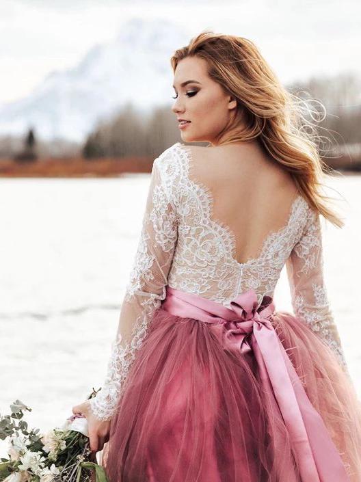 Sexy V-Neck Long Sleeve Wedding Dress for Winter Lace Applique Cheap Wedding Dress Tiered Sweet Tulle Boho Wedding Dress with Sash,1319