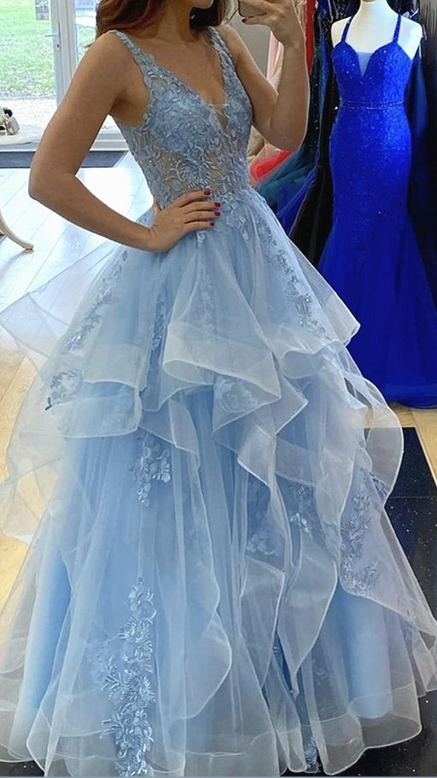 Charming light blue applique prom dresses tulle layers long evening formal gown,1353