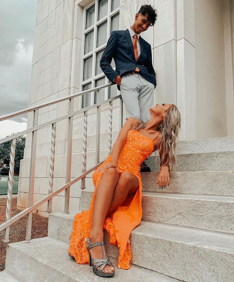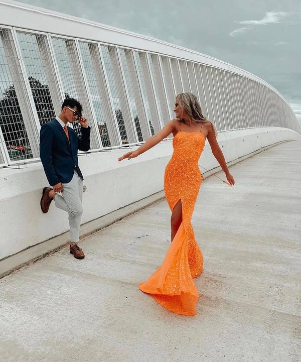 Stunning Mermaid Spaghetti Straps Orange Sequins Long Prom Dresses with Side Slit,1355