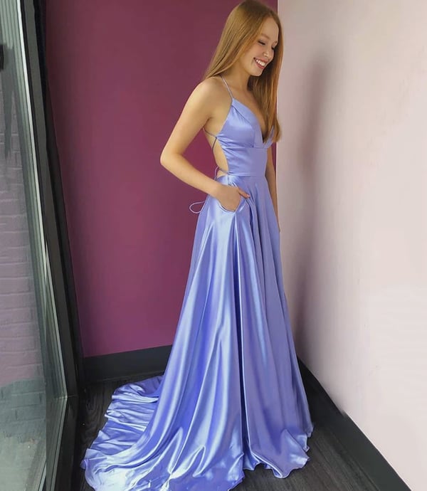 Lilac satin v neck spaghetti straps long prom dress with pockets,1413