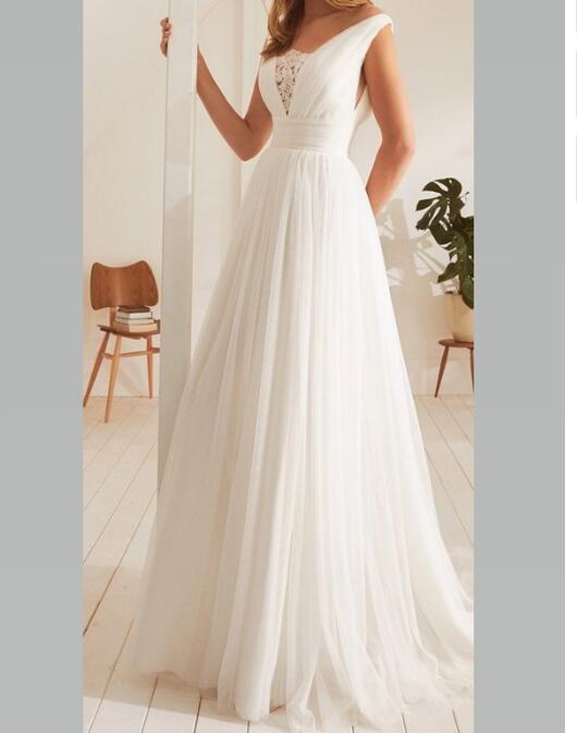 V-neckline Boho Wedding Dress Beach Simple Ivory Tulle Skirt,1432