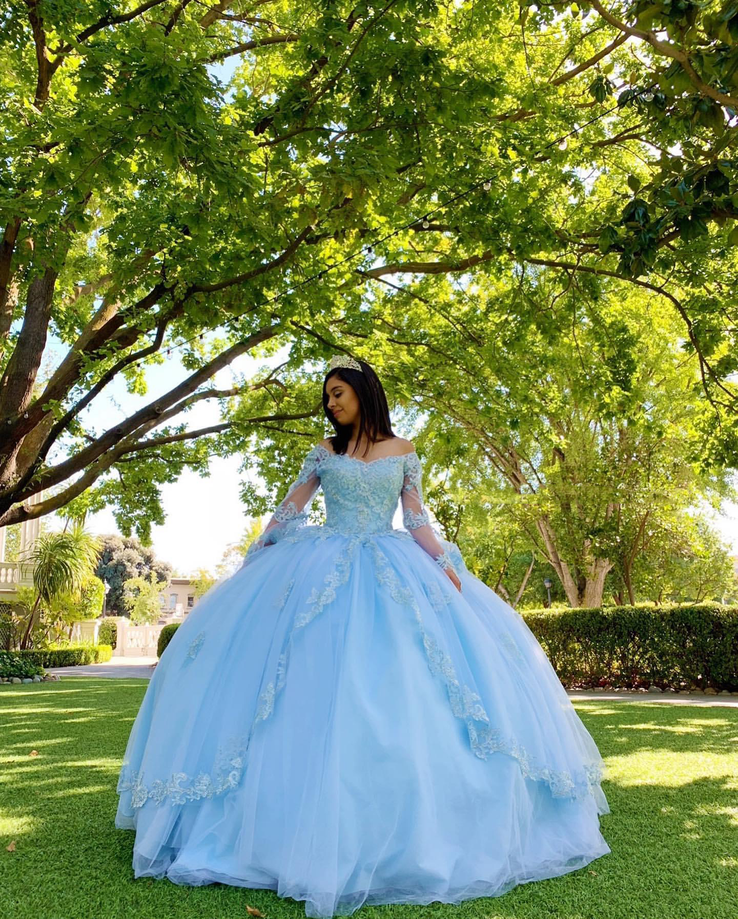 Sky blue quinceanera dresses with Long Sleeves,Ball gowns Prom Dress,Lace Applique Prom dresses 2022,1442