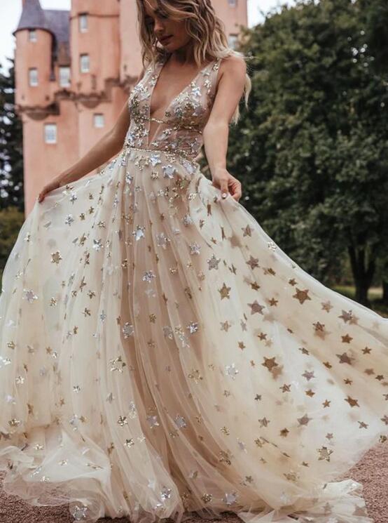 V-neck Tulle A-line Champagne Color Star Gown, Wedding Dresses, Long Prom Dresses, 2022 Prom Dresses,1451