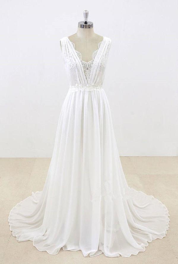 White/Ivory V Neck Lace Chiffon Handmade Flowers Beach Wedding Dress Bridal Gowns Custom Plus Size Formal Occasion Party Dress,1452