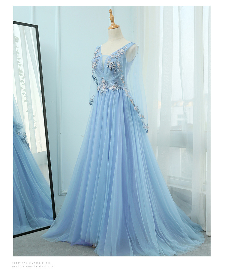 Elegant Floral Tulle Blue Prom Dress A-Line Lace Appliques with 3D Flowers Formal Evening Gowns with Cape Rehearsal Dinner Dress for Bride,1491