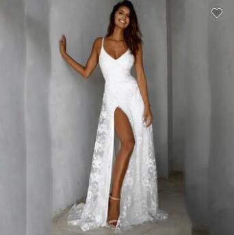 Spaghetti Straps V-Neck Sleeveless Boho Lace Backless A-Line Split Wedding Dress Bride Gown For Engagement,1535