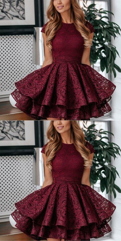 A-Line Round Neck Juniors Dresses, Short Red Lace Homecoming Dress,1550