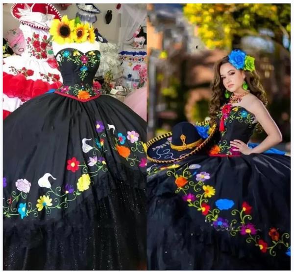 Black Mexican Style Quinceanera Dresses Charro Flowers Embroidered Lace Layers Tulle Satin prom vestidos para xv anos,1565
