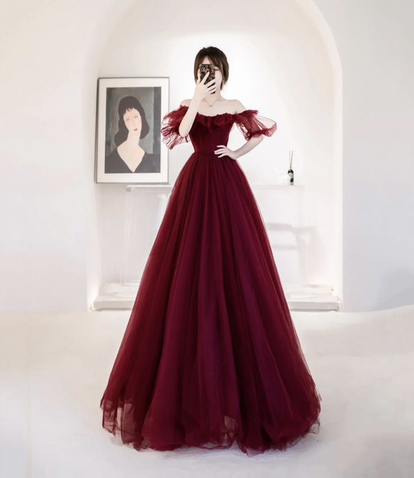 Burgundy Tulle Long Prom Dress A Line Evening Dress,1623