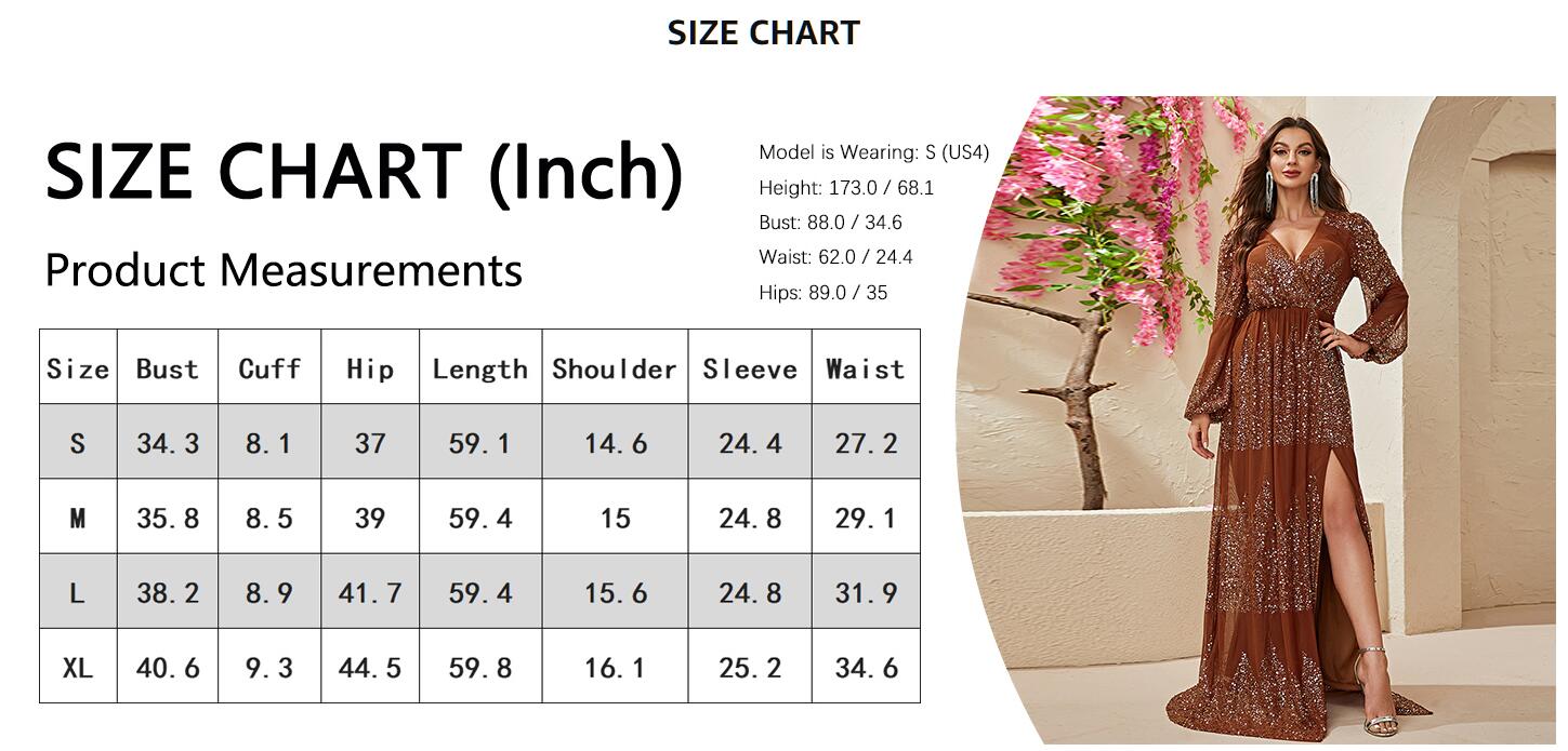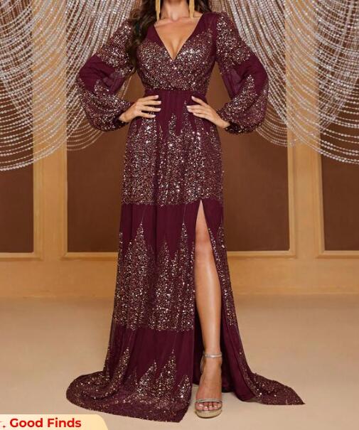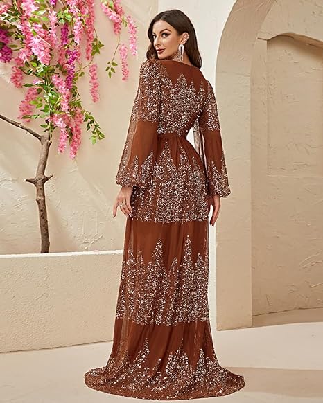 Women's V Neck Split Thigh Sequin Maxi Dress Long Sleeve Cocktail Evening Dresses,1666
