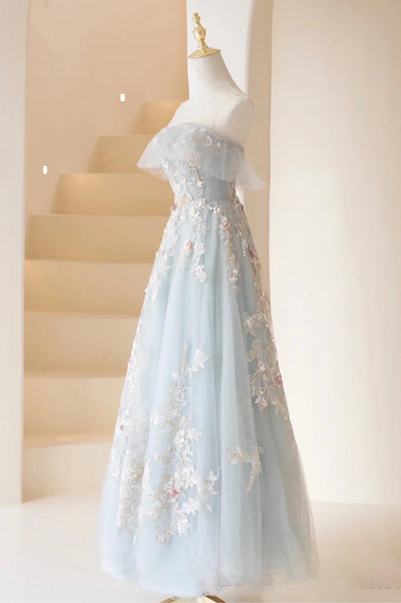 Blue tulle lace prom dress A line evening dress,1669
