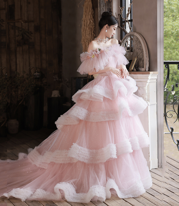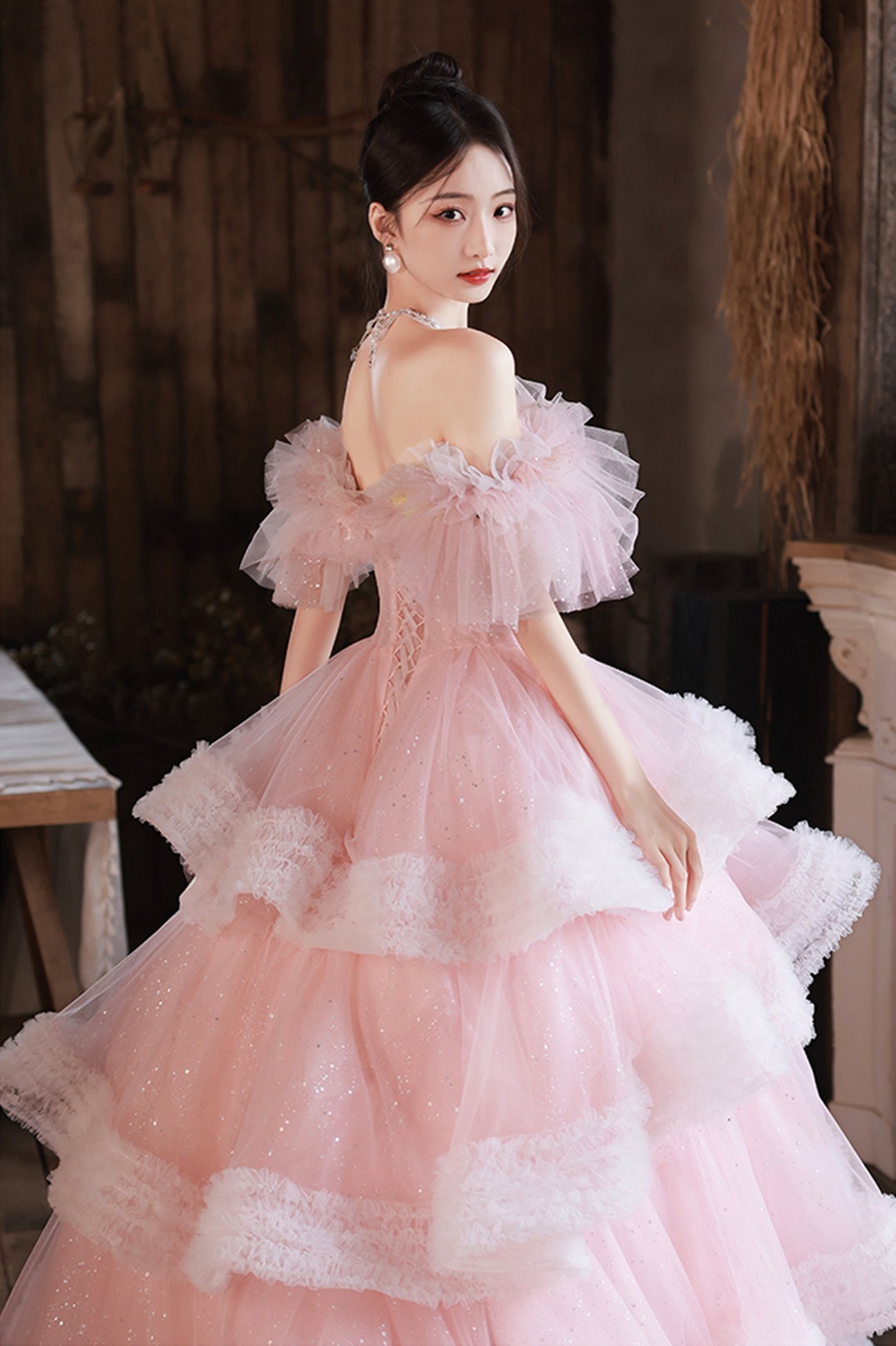 Pink Tulle Long Prom Dress Pink Evening Gown,1684