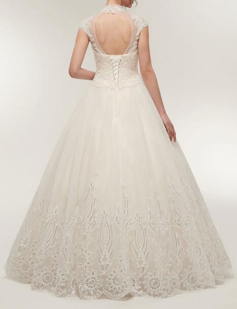 A-line High Neck Short Sleeves Long Lace Appliques Wedding Dresses with Lace-up,1713