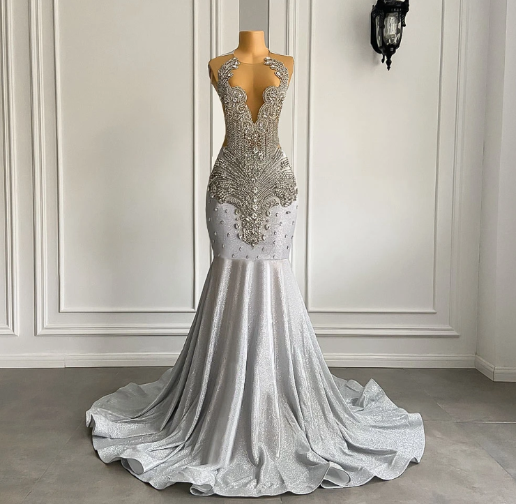 Women Silver Long Mermaid Prom Dresses 2024 Sexy Sheer Mesh Luxury Sparkly Handmade Diamond Black Girl Prom Formal Gala Gowns,1778