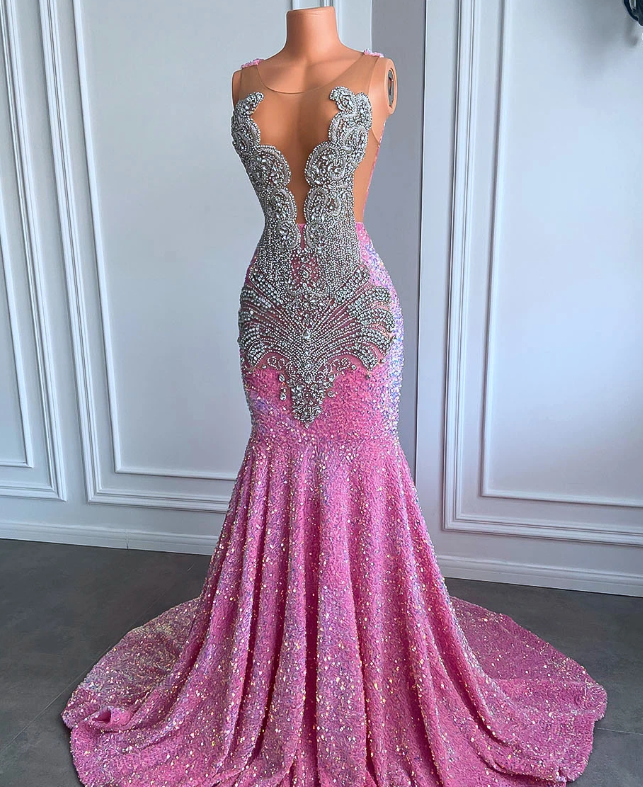 Real Picture Long Prom Dresses 2024 Sexy Mermaid Style Sheer Mesh Luxury Silver Diamond Black Girls Pink Sequined Prom Gala Gown,1780