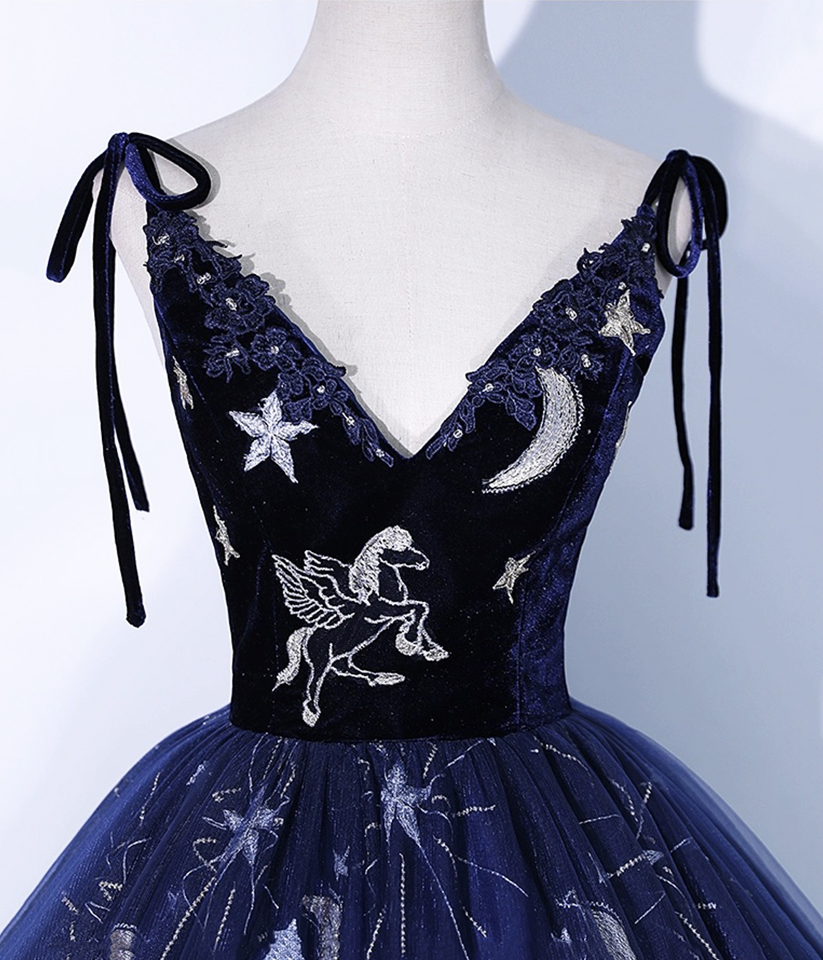 Beautiful Navy Blue Tulle Long Prom Dress, Spaghetti Straps Lace Flower Sleeveless Backless Formal Dress,1803