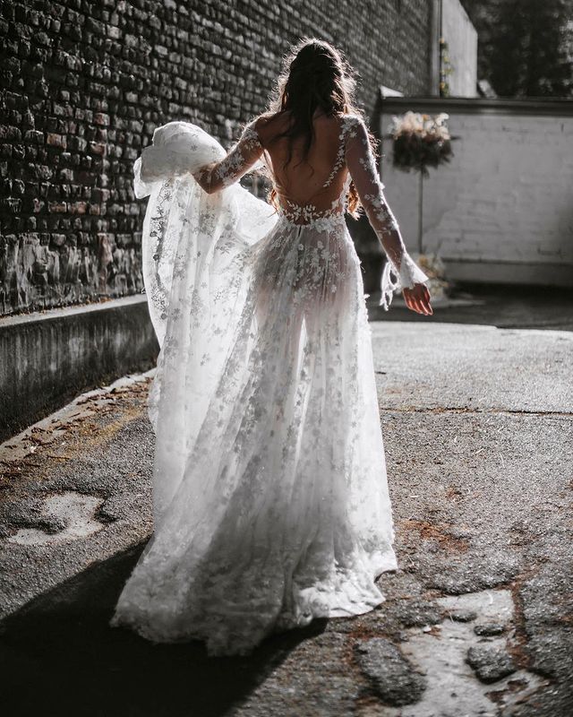 Romantic A-Line Long Sleeves White Lace Wedding Dresses,1947